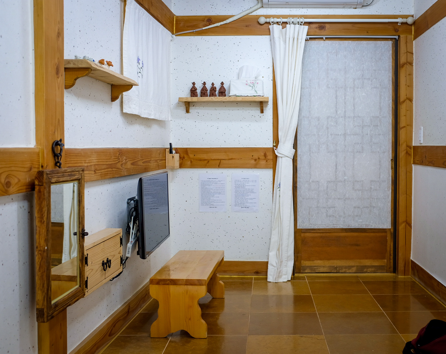 The second was when we arrived. We took a taxi from Jeonju station, which took about 15 minutes. Turns out the house was right on the edge of Jeonju Hanok Village. (Yeah, I didn’t even check where it was until I got there. Hush.) Great accessibility, but also some peace and quiet at night. You’ve already seen photos of the exterior, so I’ll skip the description. We met the host in the garden and were shown to our room.