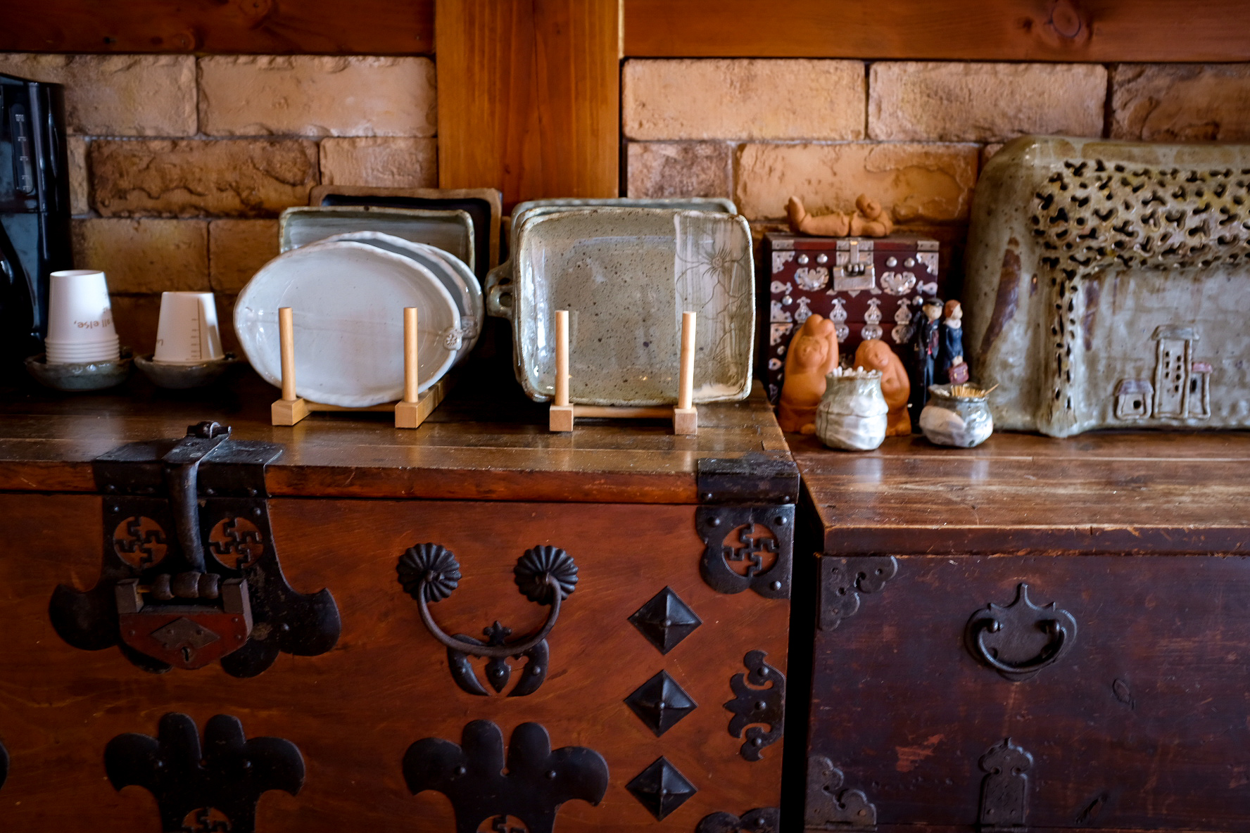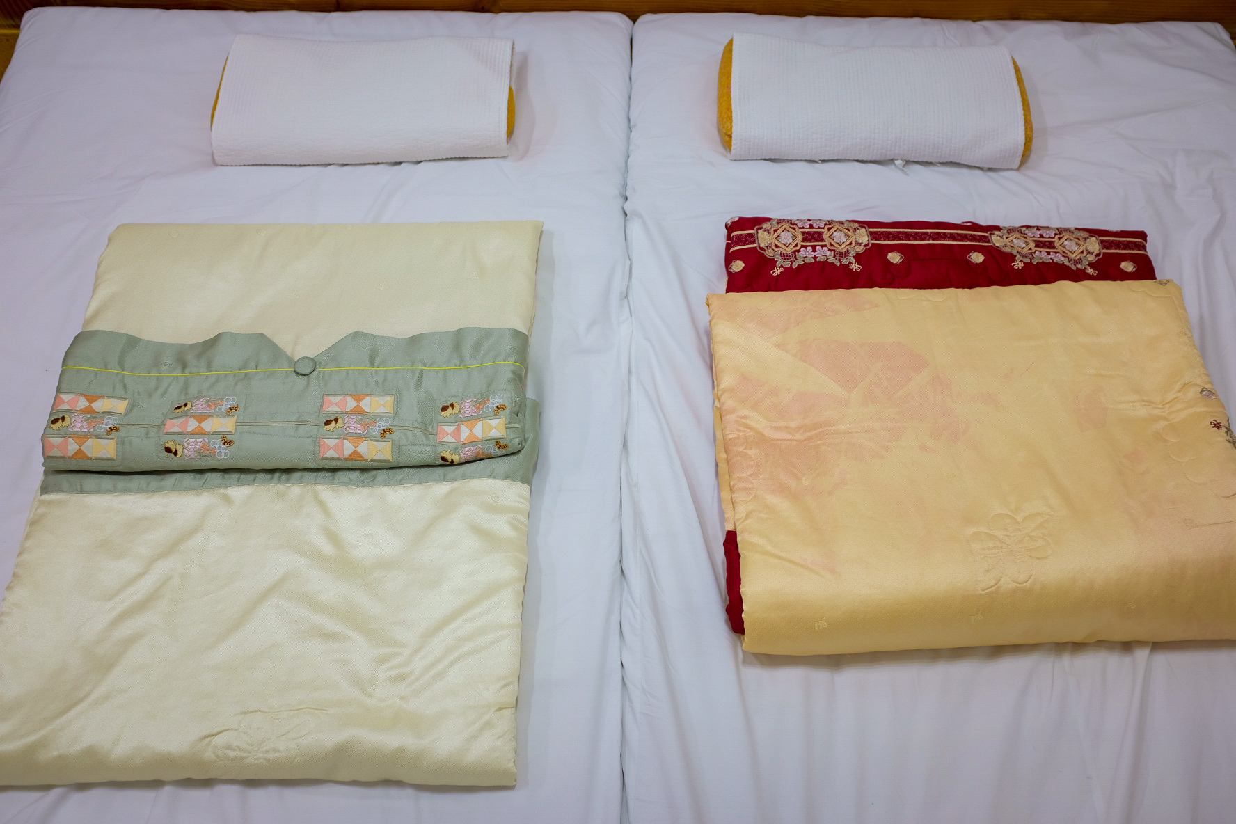 And wow? You can immediately tell the room decor is a mix of traditional and modern style – the paper-pasted door slides, the wallpaper have Hanji patterns, and the futons are folded up in the corner. Us being tired from the train ride, we went straight to the futons, spread them out, and just laid there for a while. Now, you might think it uncomfortable, staying in that room. After all, the only furniture there was the mini-table. But think about it in another way. You’ve now got the whole floor to laze about on! Also, the tiles were warm, courtesy of floor heating, and the mini-table was there if you need to put down food somewhere separate from the floor.